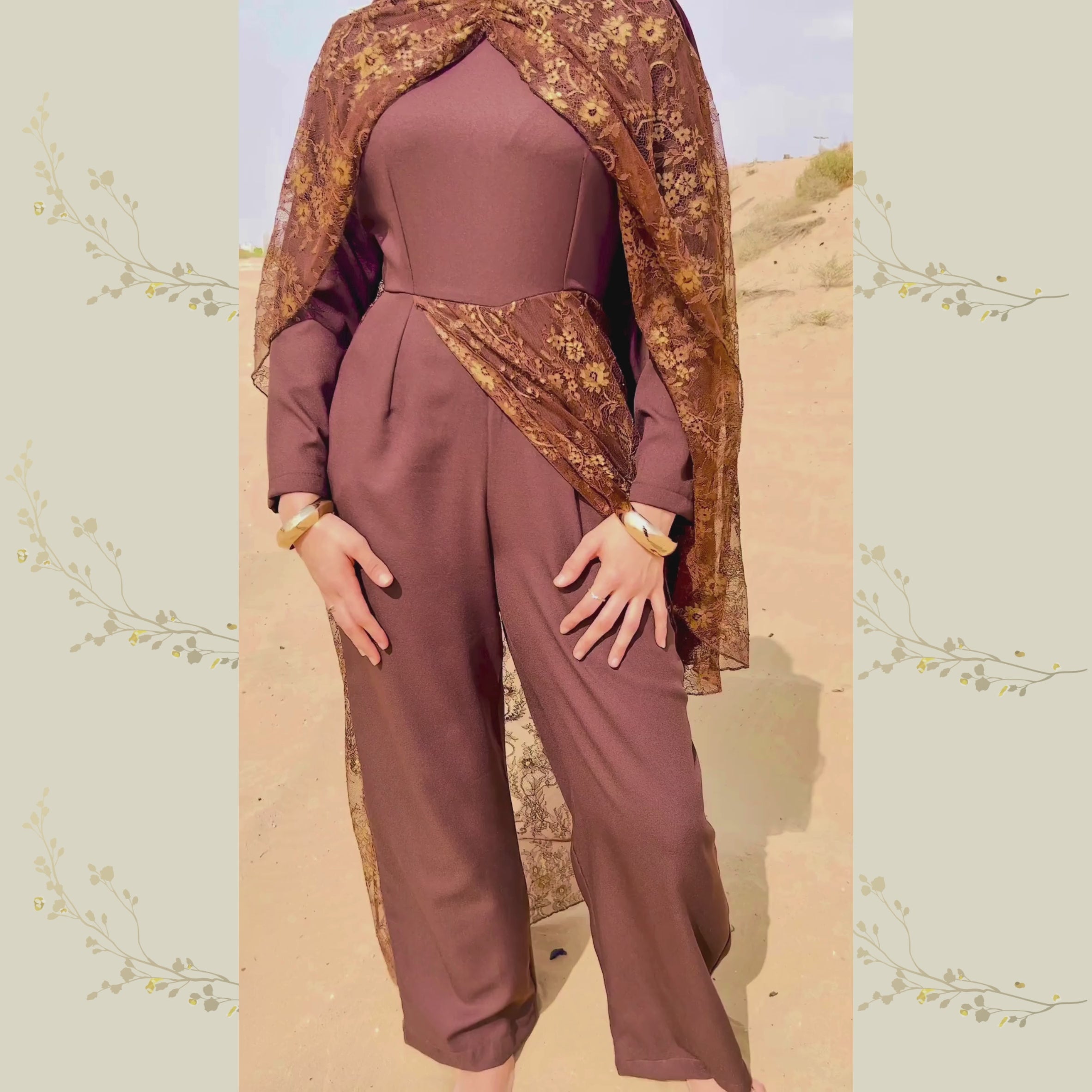 This lace-layered jumpsuit moves like a harmony of modesty and movement, flowing as day fades into dawn.